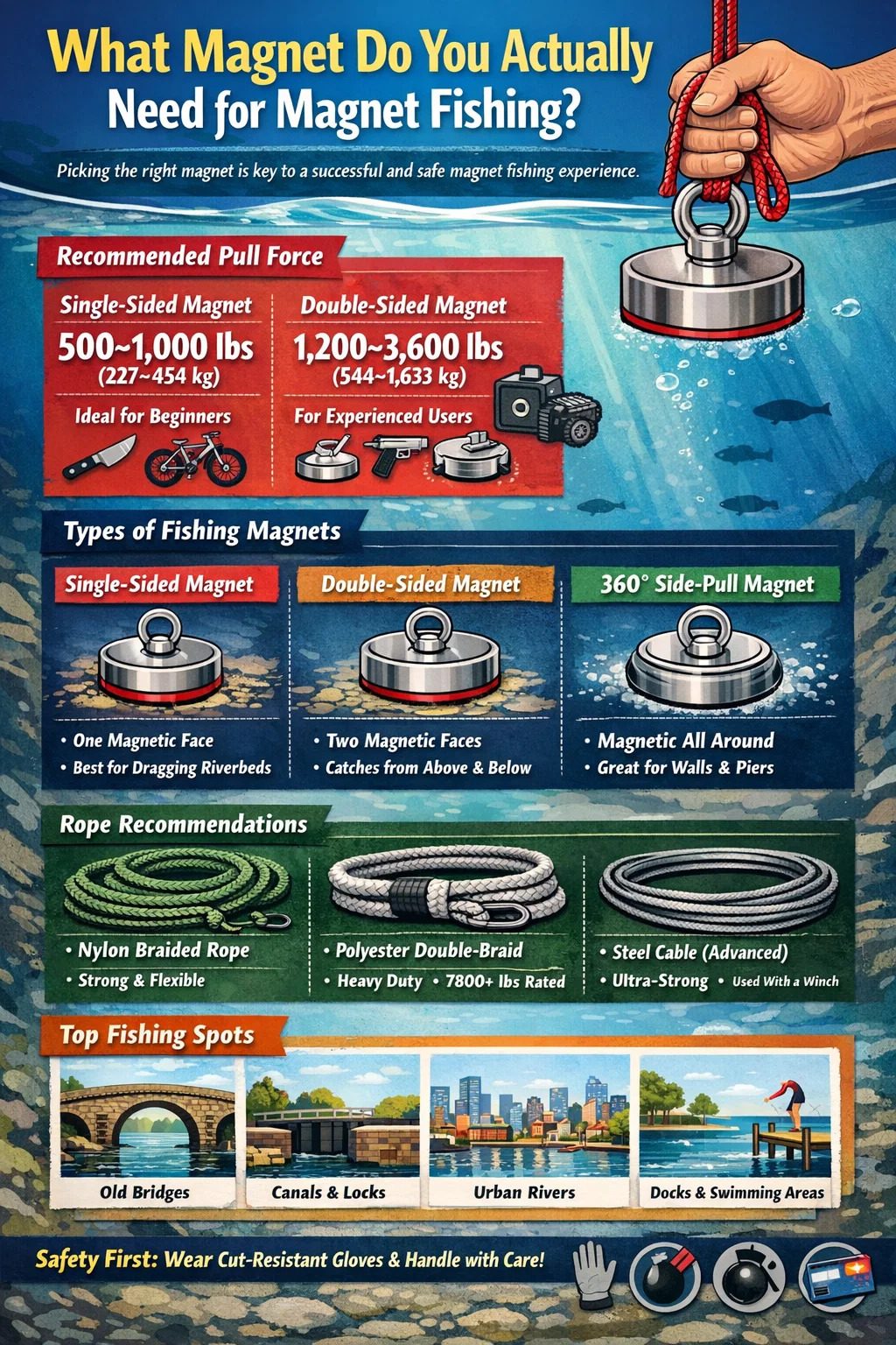 Krótka odpowiedź: dla większości początkujących a jednostronny magnes neodymowy o sile uciągu 500–1000 funtów (227–454 kg) to idealna baza wypadowa do łowienia na magnes. Jest wystarczająco mocny, aby wydobyć noże, narzędzia, rowery, a nawet sejfy z rzek i jezior, a jednocześnie na tyle łatwy w obsłudze, że można go bezpiecznie obsługiwać bez specjalistycznego sprzętu. Jeśli jesteś bardziej doświadczony lub celujesz w cięższe obiekty na głębokiej wodzie, lepszym wyborem będzie dwustronny magnes w zakresie 1200–3600 funtów.