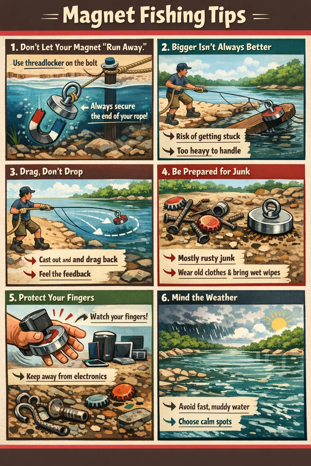 Zabezpiecz koniec liny: Podczas rzucania magnesu drugi koniec liny należy przywiązać do pasa lub słupka na brzegu. Żenująca sytuacja wrzucenia całej liny do rzeki z powodu nadmiernej siły zdarza się codziennie.