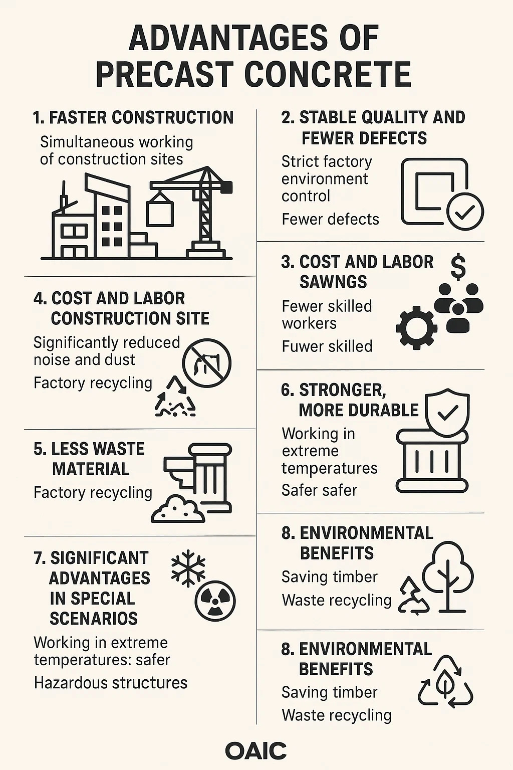 Montaż na miejscu przypomina elementy konstrukcyjne: prefabrykowany beton jest przewożony bezpośrednio na plac budowy, co pozwala zaoszczędzić czas spędzony na szalunkach, wiązaniu prętów zbrojeniowych i oczekiwaniu na stwardnienie betonu.