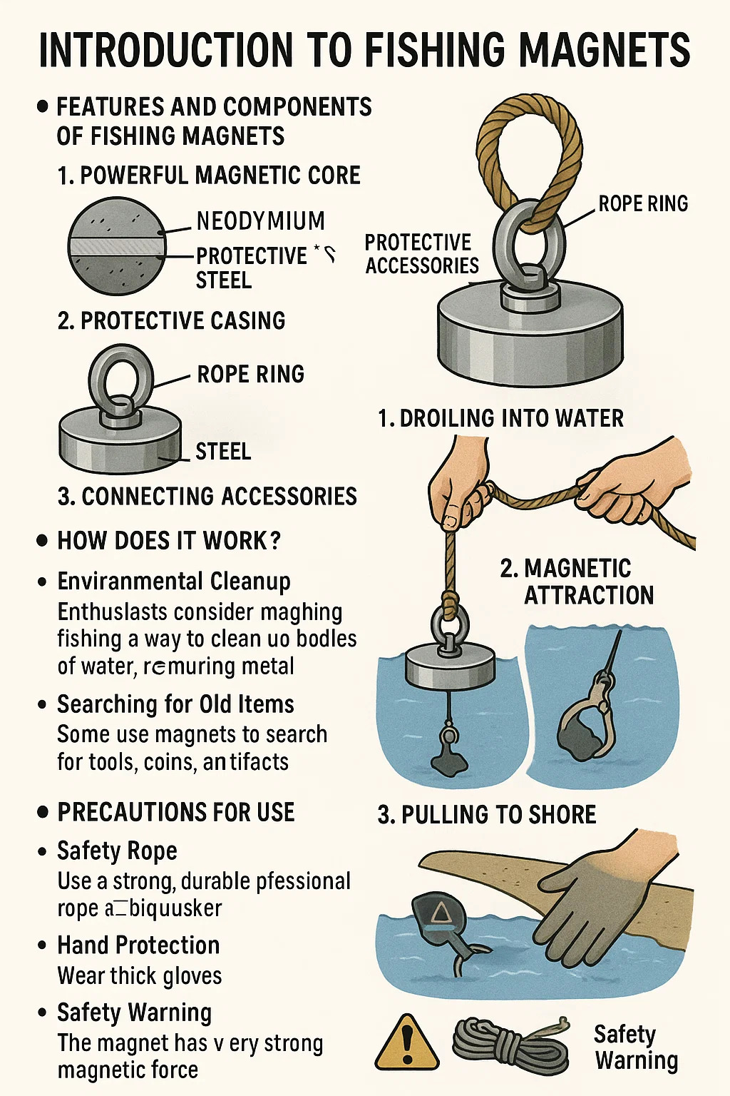 Magnes wędkarski, jak sama nazwa wskazuje, to potężne narzędzie magnetyczne służące do „łowienia” obiektów żelaznych na dnie zbiorników wodnych lub w trudno dostępnych miejscach. Wykorzystuje silną siłę magnetyczną do przyciągania i odzyskiwania metalowych przedmiotów, zastępując tradycyjne haczyki i linki.